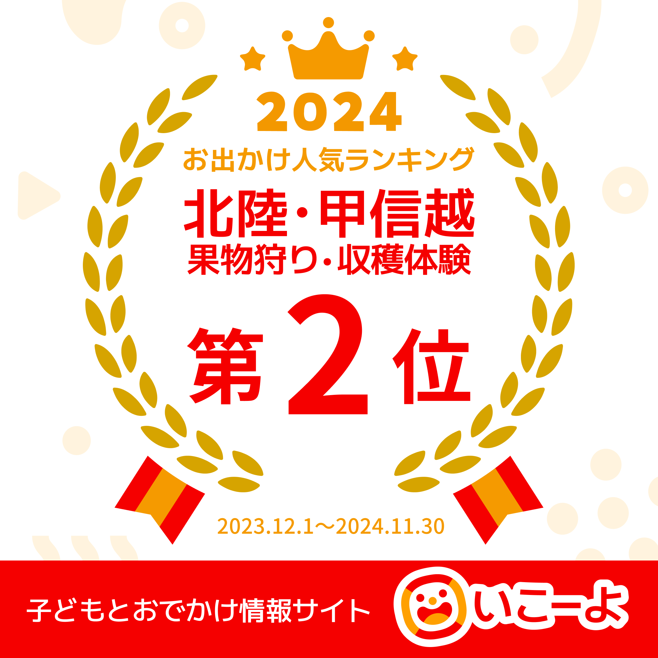 子どもとお出かけ情報サイト「いこーよ」の人気施設ランキングで、果物狩り・収穫体験施設ランキングに上位入賞いたしました。